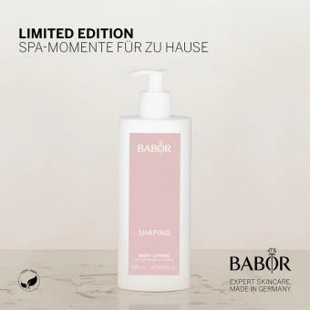Die neue Limited Edition der BABOR SPA Body Lotion der Linie SHAPING begeistert mit sanften Texturen, hochwirksamen Formeln und Inhaltsstoffen natürlichen Ursprungs. Die Kombination aus dem Wirkstoff der französischen Baumwolldistel und Stammzellenextrakten aus der Elsbeere unterstützt die natürliche Regeneration der Hautbarriere, verleiht ihr Ausstrahlungskraft und glättet die Silhouette. Die sinnliche Duftkomposition aus Orange, Mimose, Sandelholz und Moschus sorgt für perfekte SPA-Momente Zuhause. Die samtweiche BABOR SPA SHAPING Körperlotion verbessert, dank des hochwirksamen Wirkstoffs Glaucin im gelben Mohn, die Hautfestigkeit und Spannkraft der Haut.